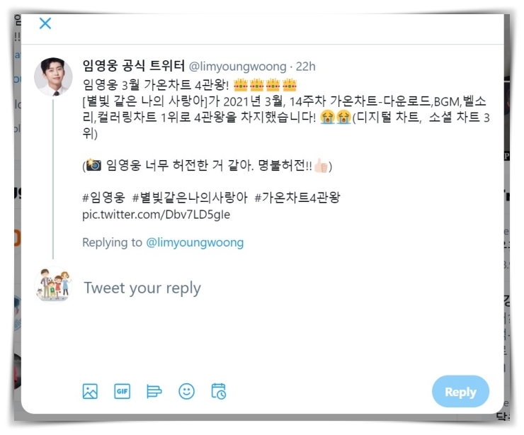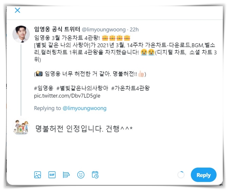 댓글을 남기고, 리트윗을 하고, 좋아요를 하시면 위에처럼 메뉴의 색이 바뀝니다. 리트윗은 회색에서 녹색으로 바뀌고, 하트도 회색에서 빨강으로 바뀝니다. 그러니까 저도 임영웅 트윗을 리트윗하고 좋아요도 눌렀고요. 그리고 댓글도 남겼습니다.
