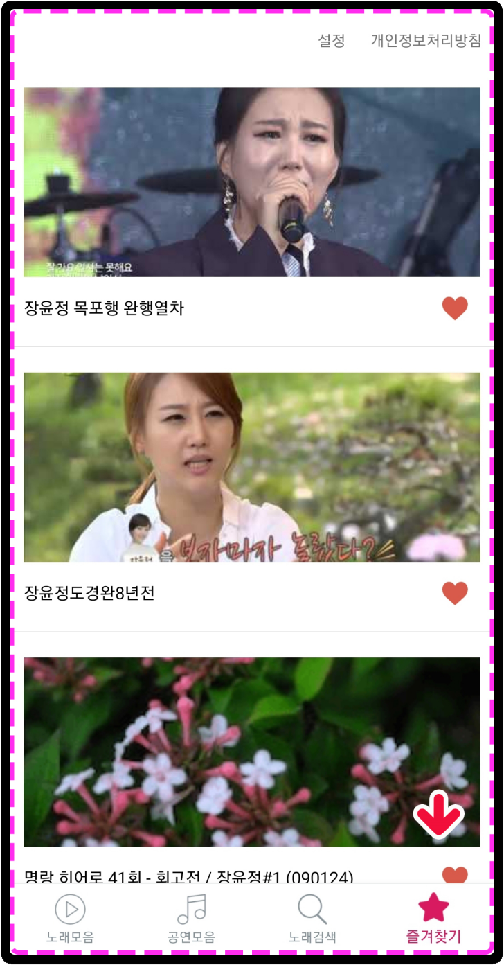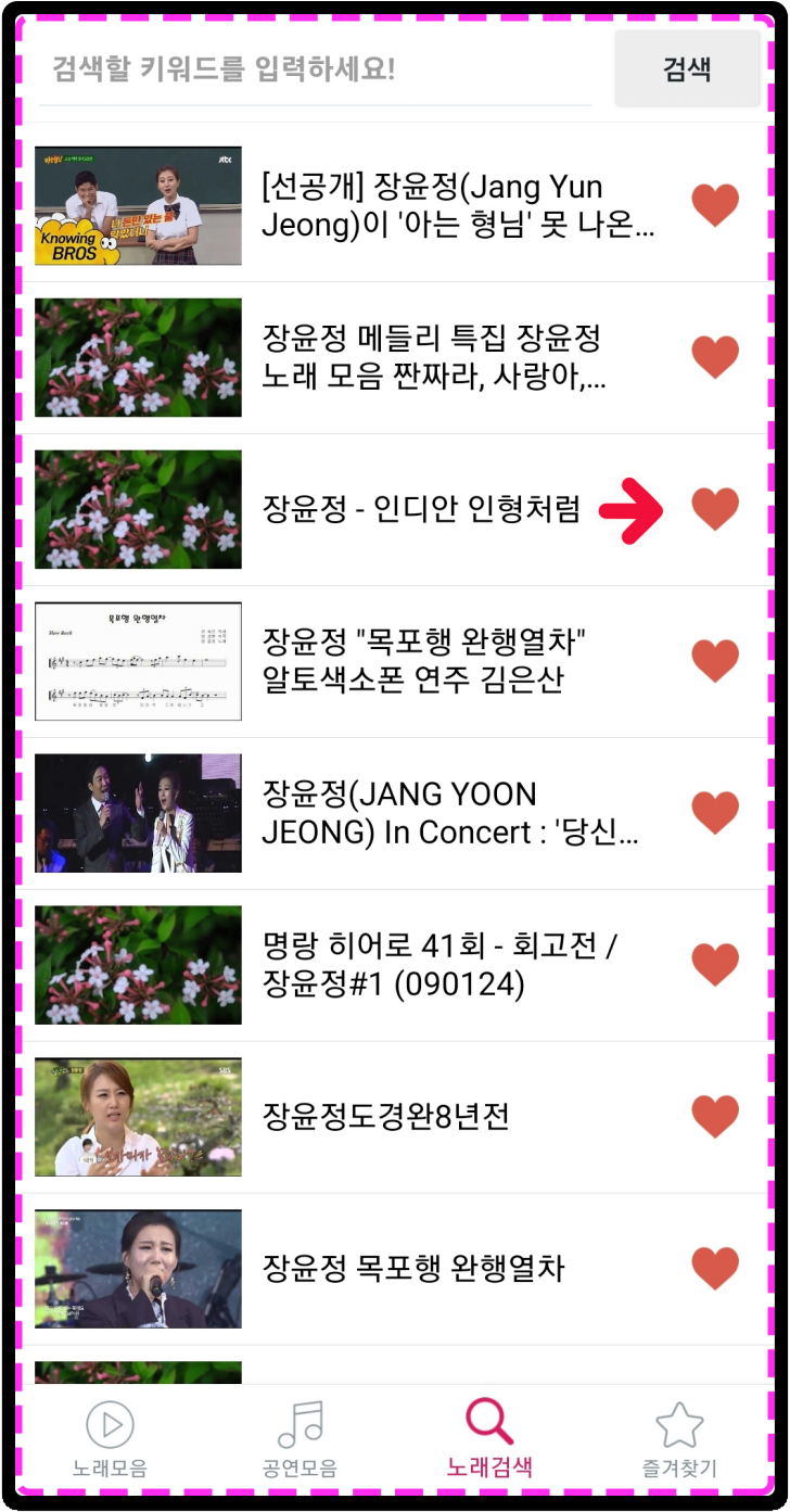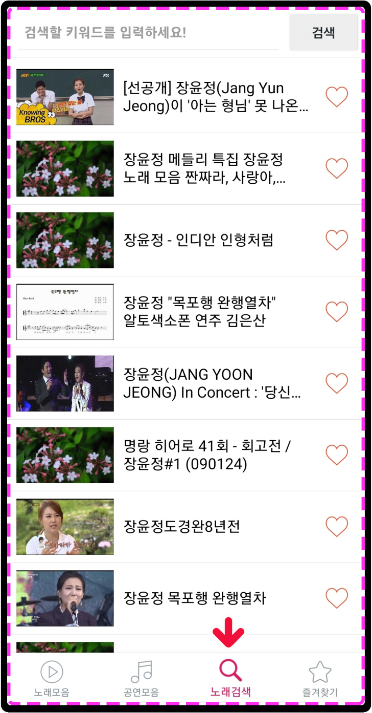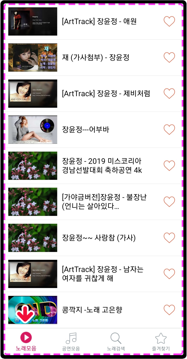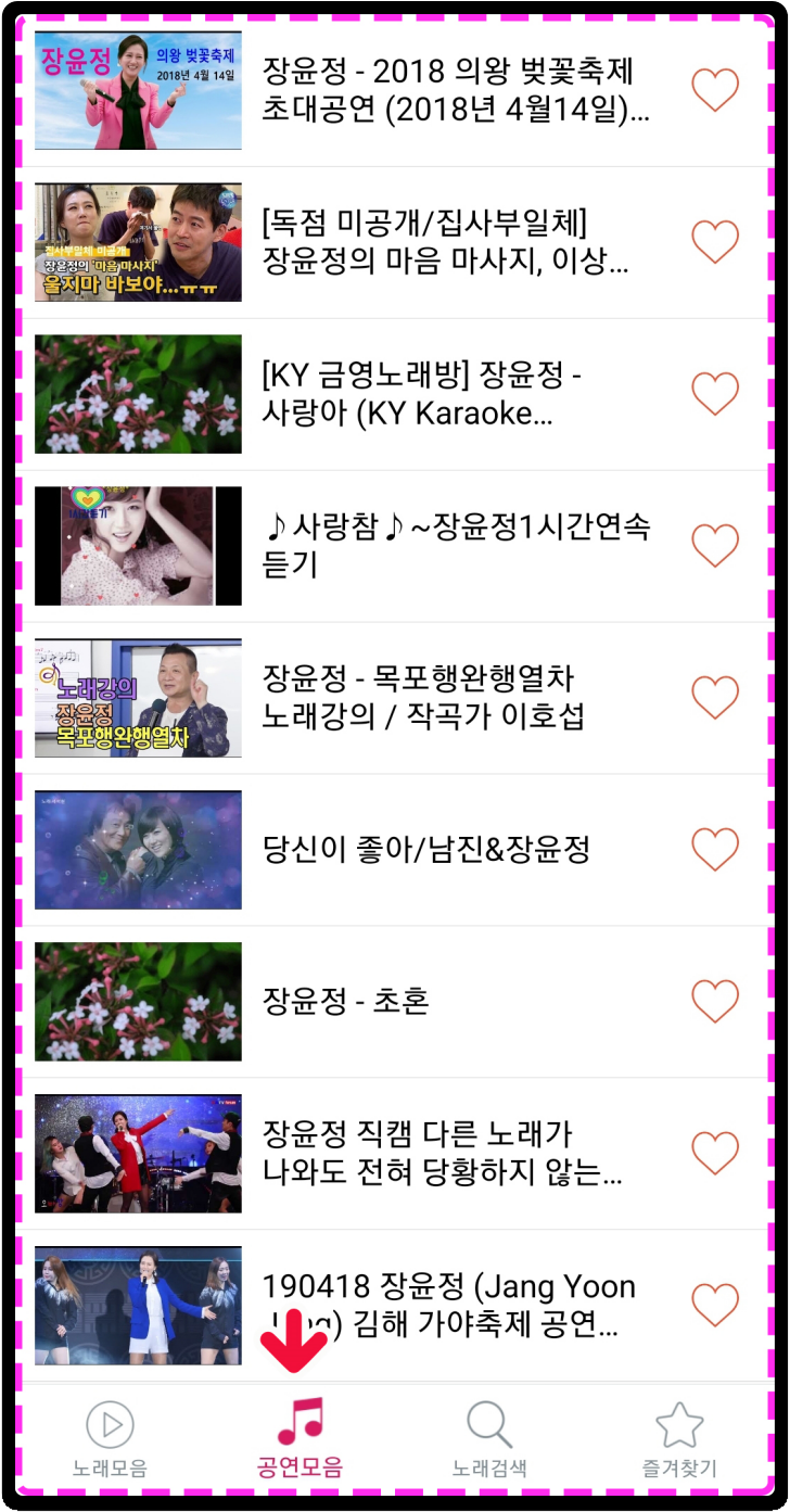 하단 메뉴에 보시면 공연 모음과 노래 검색, 즐겨찾기 메뉴가 있는데요. 공연모음으로 들어가시면 장윤정의 공연모음과 1시간 연속듣기 등 다양한 모음집을 보실 수 있습니다. 노래검색 메뉴로 들어가시면 듣고 싶은 노래를 검색하실 수 있습니다. 즐겨찾기 메뉴에서는 노래의 하트 모양을 클릭하시면 빨간 하트로 변하는데요. 즐겨찾기에 가시면 자신이 체크해 놓은 즐겨찾기 노래들을 모두 들을 수 있습니다.