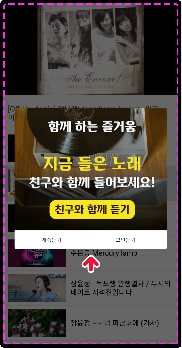 노래를 들은 후 뒤로 가기 버튼을 누르시면 팝업창이 하나 나오는데요. 지금 들은 노래 친구와 함께 들어보세요.라는 팝업창이 나옵니다. 친구에게 보낼 수도 있습니다. 같이 듣고 싶은 분이 계시다면 메시지로 보내주시면 함께 노래를 감상하실 수 있습니다.