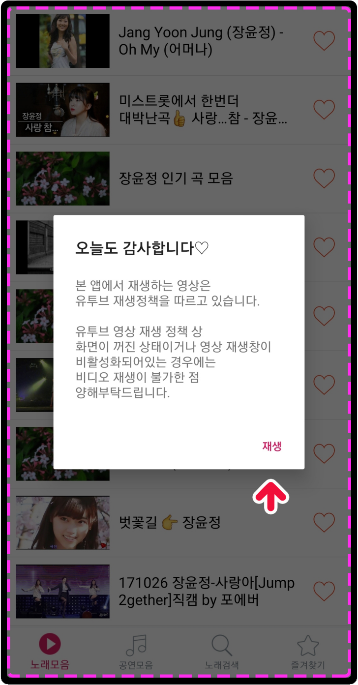 위에서 알려드린 앱 설치 바로가기를 따라 자신의 핸드폰에 앱을 설치하시고, 앱을 실행시키시면 아래와 같은 메인 화면이 나옵니다. 메인 화면에서 우선 자신이 좋아하는 노래를 클릭하시면 바로 재생이 가능합니다. 어머나를 클릭하시면 팝업창 오늘도 감사합니다. 가 나오면서 유튜브 영상 재생 정책이 나옵니다. 재생을 누르시면 바로 상단에서 어머나가 나옵니다. 언제 들어도 참 즐거운 노래입니다.