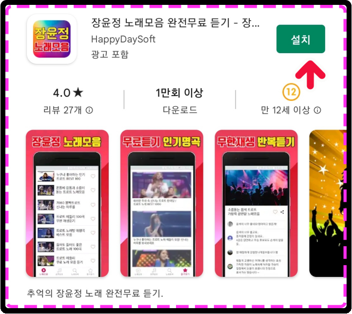 장윤정 노래를 실시간으로 듣기 위해서는 자신의 핸드폰에 앱을 하나 설치하셔야 합니다. 앱 설치 및 노래를 듣는 것은 모두 무료로 제공됩니다.(단, 데이터 무제한에 한합니다.) 우선 아래 앱설치 바로가기를 통해 설치 페이지로 이동하신 후 자신의 핸드폰에 설치하시면 됩니다. (앱 설치 바로가기)