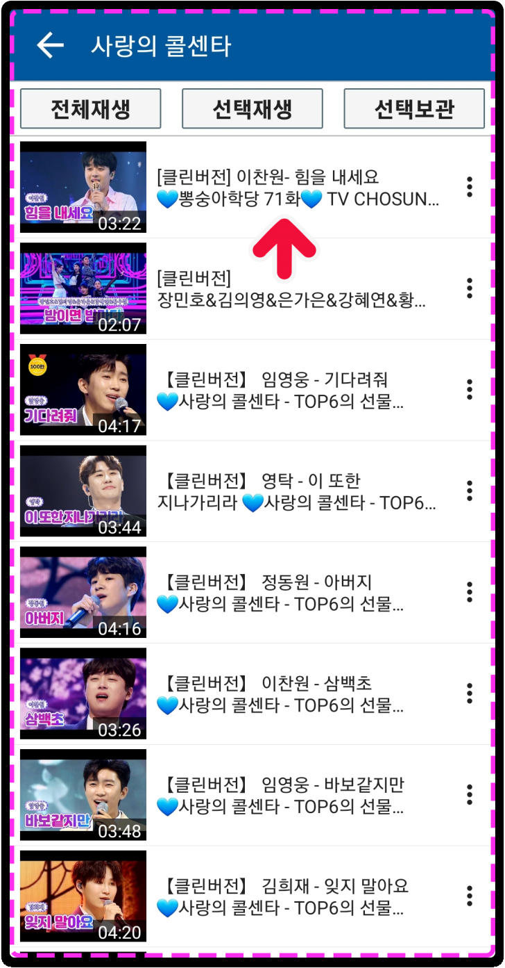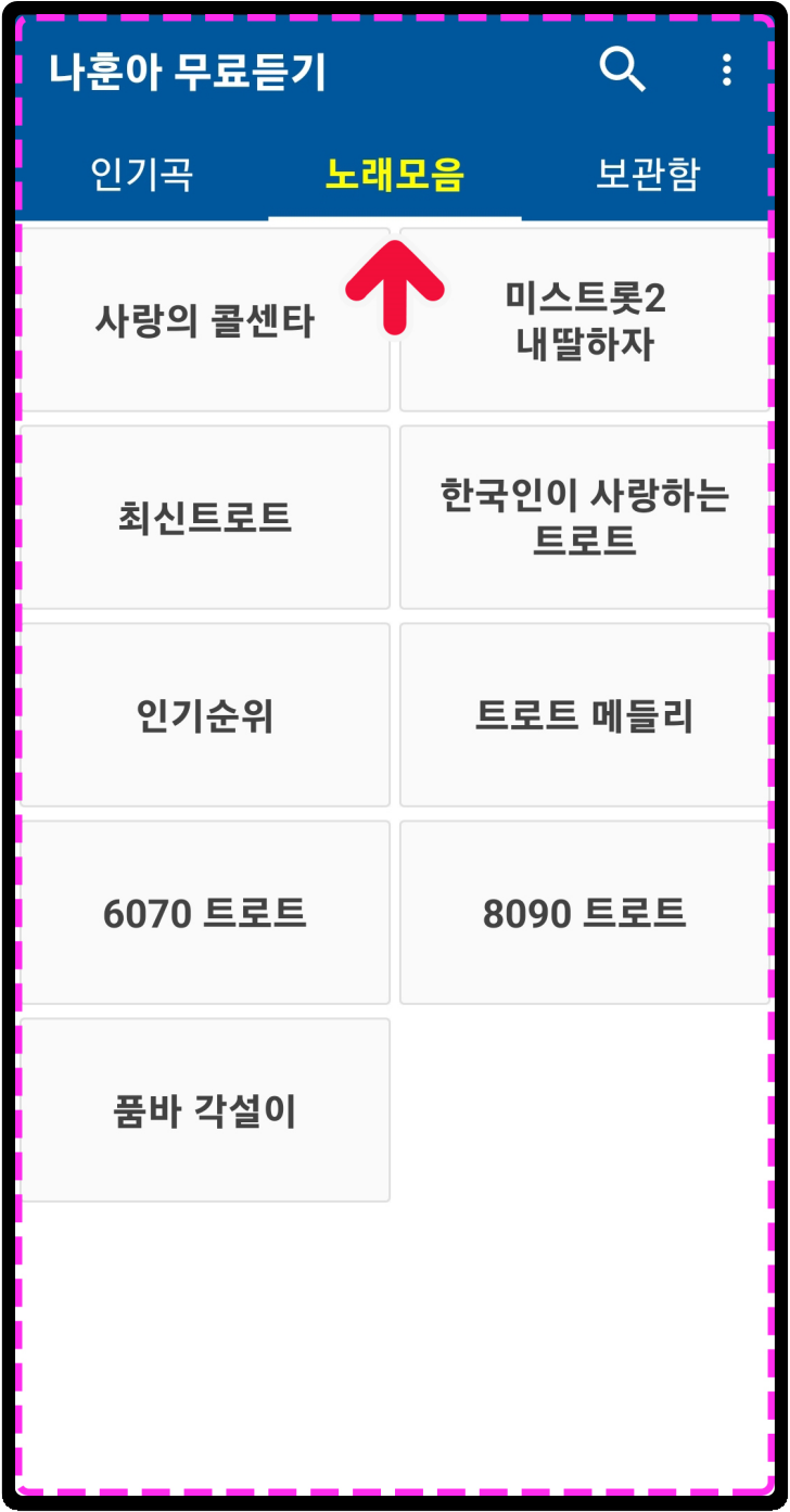 또한 앱에서 노래모음으로 들어가시면 사랑의 콜센타, 미스 트롯 2 내딸하자, 최신 트로트, 한국인이 사랑하는 트로트, 인기순위, 트로트 메들리, 6070 트로트, 7080 트로트, 품바 각설이까지 다양한 노래를 함께 즐기실 수 있습니다. 사랑의 콜센타로 들어가시면 이찬원을 비롯하여, 장민호, 임영웅, 영탁, 정동원, 김희재의 노래를 함께 즐기실 수 있습니다.
