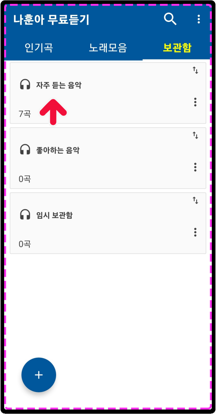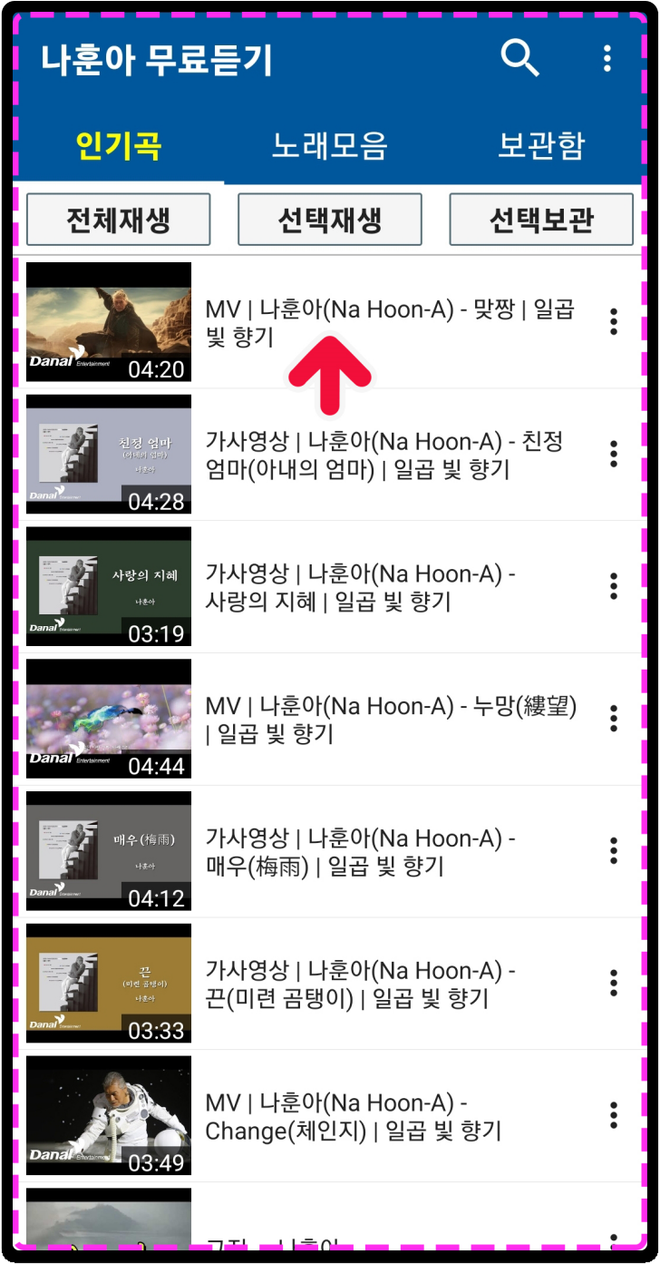 전체 재생, 선택 재생, 선택 보관 메뉴가 있는데요. 전체 재생을 누르시면 모든 곡을 순차적으로 들으실 수 있습니다. 또한 자신이 듣고 싶은 곡만을 선택하셔서 선택 보관을 누르시면 오른쪽 아래처럼 자주 듣는 음악, 좋아하는 음악, 임시 보관함이 나오는데요. 여기에서 자주 듣는 음악에 보관하시면 보관함에서 바로 자신이 좋아하는 나훈아 노래 모음을 들으실 수 있습니다.