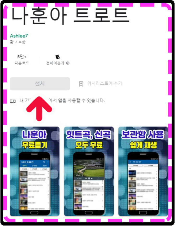 나훈아 노래모음을 실시간으로 듣기 위해서는 자신의 핸드폰에 우선 앱을 설치하셔야 합니다. 앱 설치 및 노래 듣기는 모두 무료로 들으실 수 있습니다. 아래 앱 설치 바로가기를 통해서 설치 페이지로 들어가신 후에 자신의 핸드폰에 설치하시면 됩니다. 안타깝게도 안드로이드폰, 삼성폰에서만 설치가 가능하고, 아이폰에서는 설치가 불가능합니다.(앱 설치 바로가기)