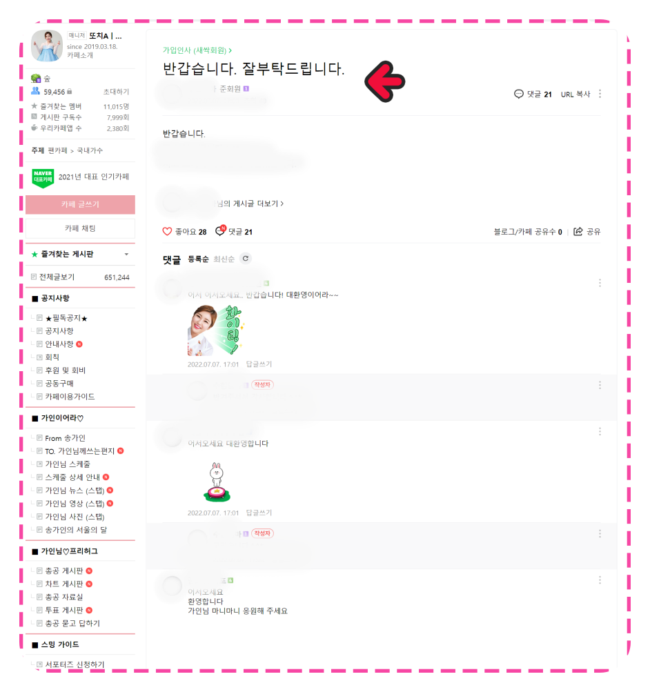 가입인사를 하시면 바로 준회원으로 등업이 됩니다. 그리고 가입인사를 함과 동시에 팬카페 회원분들이 격하게 반겨주십니다. 정말이지 순식간에 반겨주신다는 글이 수십 개가 달립니다.