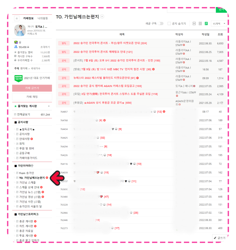 일반회원이 되어야 하는 가장 큰 이유는 바로 From 송가인, TO. 가인님께 쓰는 편지를 읽을 수 있고 쓸 수 있는 권한이 생기기 때문입니다. 물론 다른 글들을 모두 확인할 수 있는 이유도 있기는 하지만, 제가 생각하는 가장 큰 이유는 바로 이것입니다. From 송가인의 글을 읽을 수 있는 이유입니다.