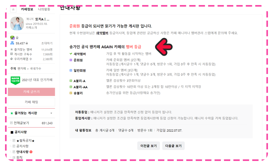아무튼 우선적으로 일반회원까지는 등업이 되어야지만, 카페의 모든 글을 읽을 수 있고, 작성할 수 있는 권한이 생깁니다.
