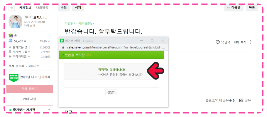 카페 관리가 잘 되어 있는 걸 느낄 수 있는 첫 번째 항목입니다. 가입을 환영합니다. 팝업창에 글귀나 이미지 깔끔하게 잘 정리되어 있습니다.