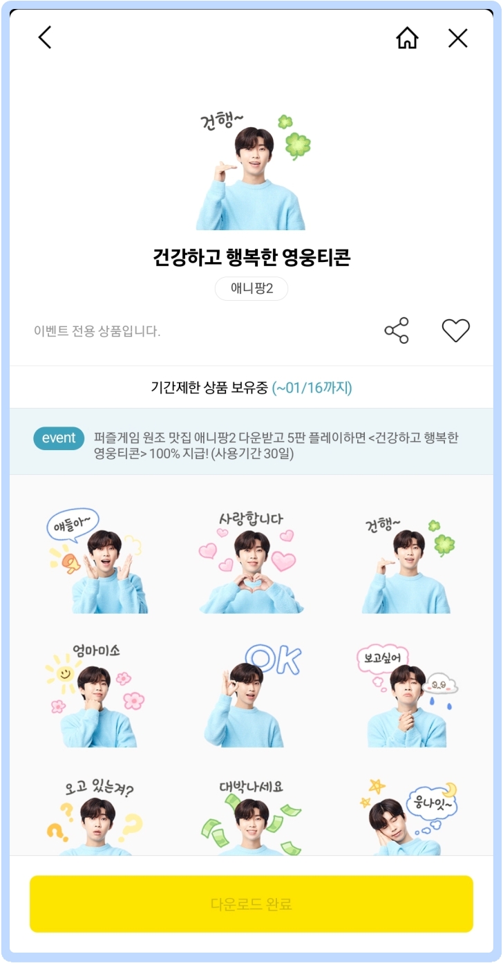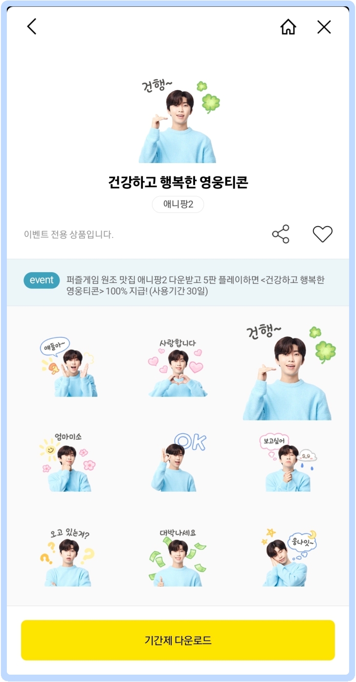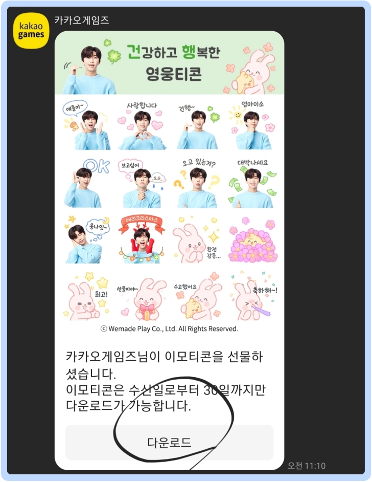 오른쪽 위처럼 카카오게임즈님이 이모티콘을 선물하셨습니다. 이모티콘은 수신일로부터 30일까지만 다운로드가 가능합니다. 기간제 다운로드를 클릭하시면 자신의 카카오톡으로 건행 영웅티콘을 하나하나씩 모두 사용하실 수 있습니다.
