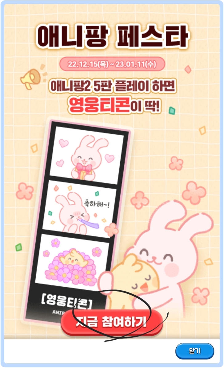 애니팡 2에서 4까지 영웅은, 영원해로 우리의 히어로가 나타 탔습니다. 영웅과 영웅의 만남 애니팡 페스타입니다. 여기서 주의할 점 먼저 하나 알려드립니다. 기간이 정해져 있습니다. 무한정으로 하는 게 아닙니다. 2022년 12월 15일부터 2023년 1월 11일까지만, 임영웅 영웅티콘을 받으실 수 있는 겁니다. 애니팡 2,3,4를 실행만 하신다면, 자신의 카톡으로 히어로의 영웅티콘을 받을 수 있습니다.
