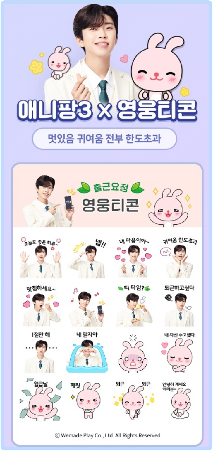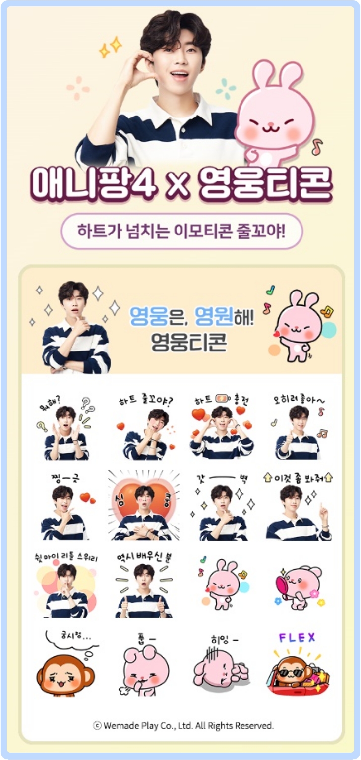 애니팡 2에서는 건행 영웅티콘을, 애니팡 3에서는 출근요정 영웅티콘을, 애니팡 4에서는 영웅영원 영웅티콘을 각각 받으실 수 있습니다. 한 장 한 장 사용하는 것이 아니라, 아이티콘 하나씩 사용 가능합니다. 음~ 그러니까 모두 30개의 영웅티콘을 무료로 사용 가능하다는 이야기입니다.