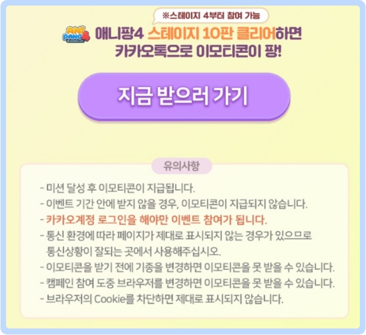 애니팡 3도 2와 마찬가지로 게임을 설치하고 5게임만 진행하시면 됩니다. 단, 애니팡 4는 클리어를 해야 하는 조금은 어려운 방법이긴 하지만, 애니팡 자체가 그렇게 어려운 게임이 아니라서, 몇 번 하시다 보면, 클리어하실 수 있으실 겁니다.