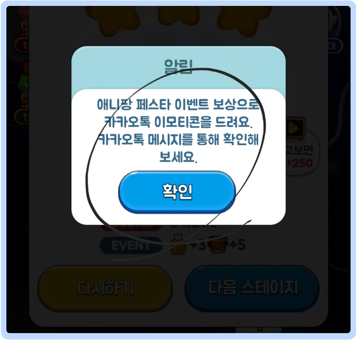 애니팡에서 5게임만 실행하면, 바로 왼쪽 위처럼 게임에서 팝업창이 하나 뜨는데요. 애니팡 페스타 이벤트 보상으로 카카오톡 이모티콘을 드려요. 카카오톡 메시지를 통해 확인해 보세요. 확인을 클릭하시면 자신의 카카오톡으로 띵동! 하고 한통의 메시지가 전달되어 있을 겁니다.