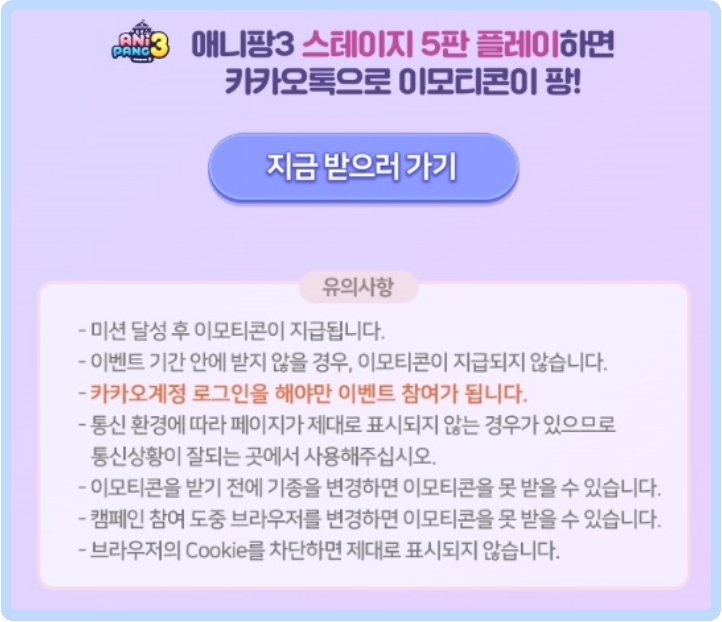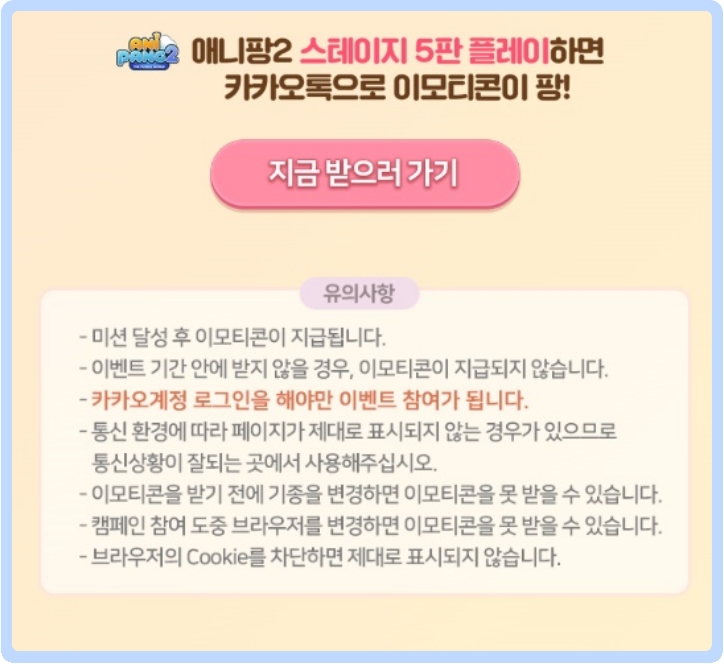 여기서 아셔야 할 것이 하나 있는데요. 이벤트의 조건을 보면, 클리어, 그러니까 격파, 통과의 의미가 아닙니다. 애니팡 2를 자신의 핸드폰에 설치하고, 게임을 5번만 진행하시면 된다는 조건을 알아야 합니다. 그러니까 잘 못하시는 게임을 격파, 완료하시려고 하지 마시고, 그냥 가만히 지켜보셔도 되고, 게임을 잘하는 다른 누군가에게 부탁을 해도 되고, 아무튼 제일 중요한 건 5판만 그냥 하면 된다는 이야기입니다.
