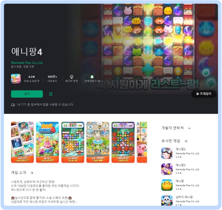 애니팡은 위메이드에서 만든 게임이니다. 기존부터 알고 계시던 분들도 계시겠지만, 아무튼 게임을 자신의 핸드폰에 설치해서 게임을 진행하면 됩니다. 삼성폰이나 아이폰 모두 가능하고요. 아래 바로가기를 통해 자신의 핸드폰에 설치가 가능합니다.