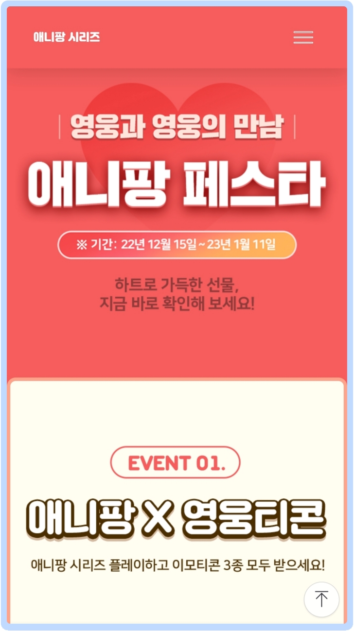 영웅와 영웅의 만남이라는 콘셉트로 애니팡에서 이벤트를 진행하고 있습니다. 위에서도 말씀드렸지만, 가장 중요한 것이 바로 기간이 정해져 있다는 것을 가장 먼저 아셔야 합니다. 그 기간 안에 진행하지 않으면, 더 이상 임영웅 영웅티콘을 받을 수 없다는 이야기 입니다. 가장 중요한 애니팡 영웅티콘 기간은 2022년 12월 15일부터 2023년 1월 11일까지 입니다. 이 기간안에 모두 진행을 하셔야지만, 애니팡 2, 애니팡 3, 애니팡 4에서 이모티콘 3종 세트를 받으실 수 있습니다.