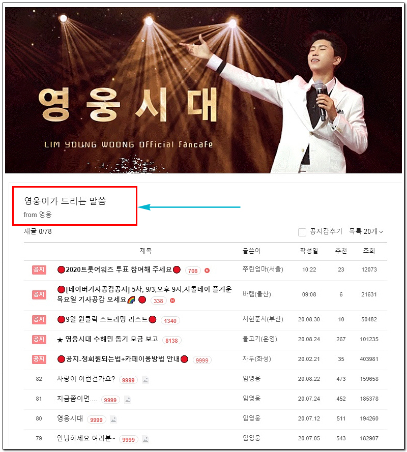 영웅시대 정회원이 되어야지만, 영웅이가 드리는 말씀의 게시판을 들어가실수 있고, 글을 읽을수 있고, 댓글을 남길수도 있습니다. 이보다 더 큰 이유는 없습니다. 그러니까 우리모두 공식팬카페 영웅시대로 회원가입을 해야 하는것이 맞는것 같습니다. 아무튼 여기 댓글들을 보면 기본적으로 9999가 넘어섰습니다. 그 어떤 스타가 이런 댓글들을 받을수 있을까요? 역시 우리의 히어로 임영웅이 맞습니다.