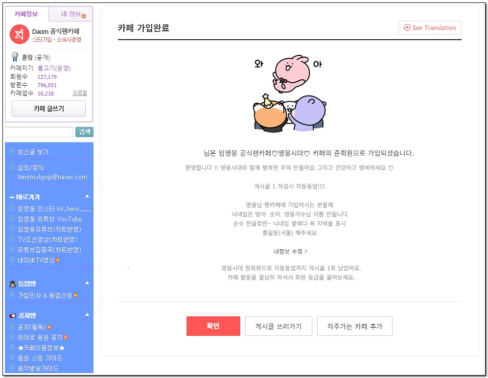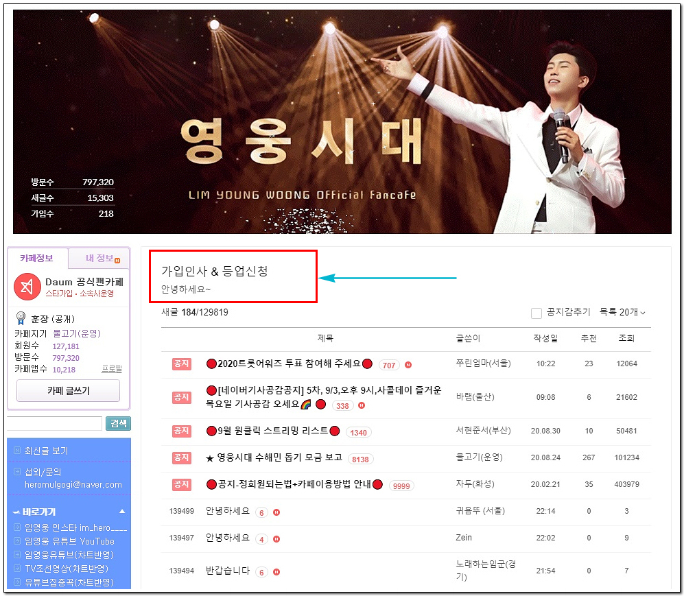 저는 히어로 임영웅 팬카페 영웅시대의 정회원 입니다. 인터넷에 여러군데 히어로 임영웅의 팬카페가 존재하지만, 소속사가 운영하는 임영웅 공식팬카페는 영웅시대라고 할수 있습니다. 현재 다음 공식 팬카페 이며, 영웅시대 팬카페 회원수는 무려 127,000명에 달합니다. 방문수는 800,000을 넘어섰으며 새글 또한 15,000건이 넘어섰습니다. 그중에서도 가장 매력적인 이유중에 하나가 우리의 히어로 임영웅님이 글을 남겨주신다는 거지요. 공식팬카페에만 글을 남겨주시기에 이것 하나만으로도 우리는 영웅시대 팬카페에 가입을 해야 하는 겁니다. 카페 회원들에게만 공개를 하기 때문에 이 또한 카페를 가입해야 하는 이유중에 하나입니다. 아래는 임영웅 팬카페 영웅시대 가입하는 방법을 알려드리겠습니다. 어렵지 않으니까 쉽게 따라하시면 됩니다. 어려운거 있으면 물어보시면 최대한 자세하게 알려드리겠습니다.