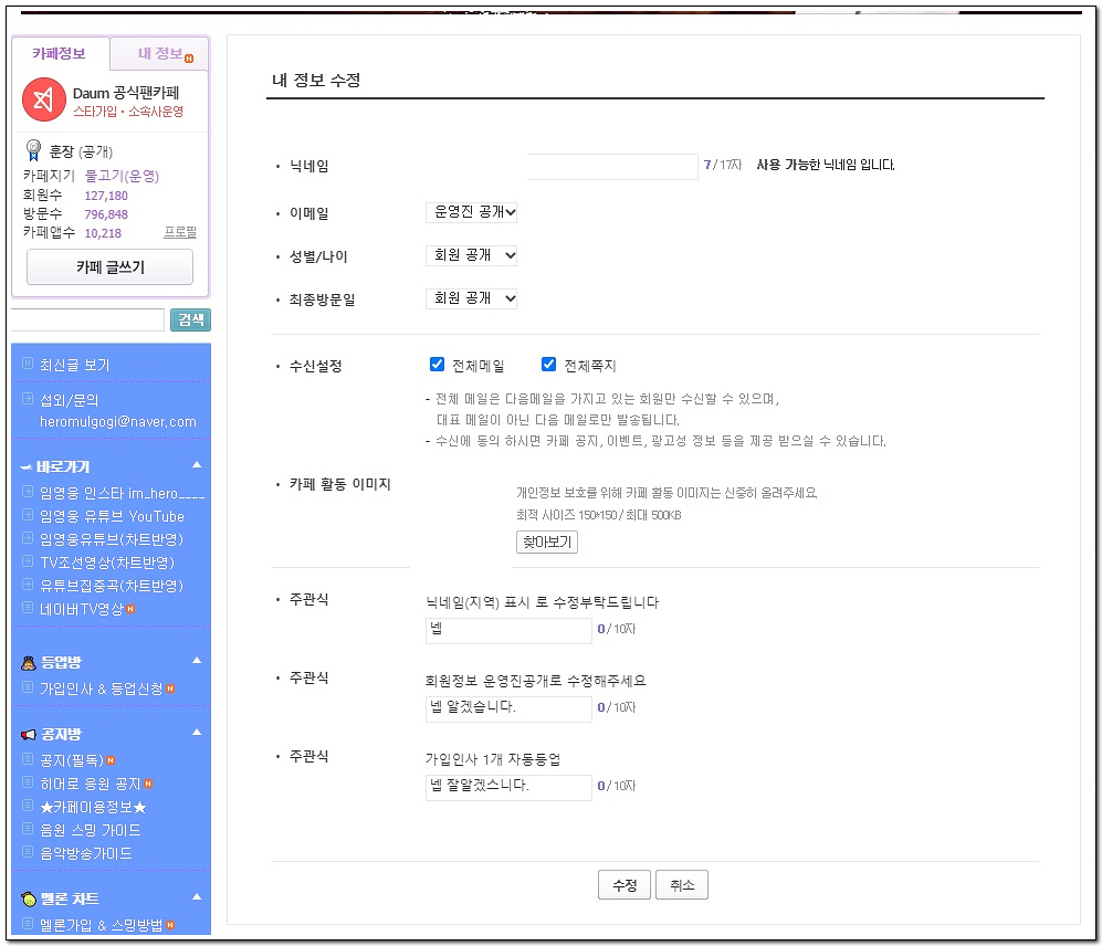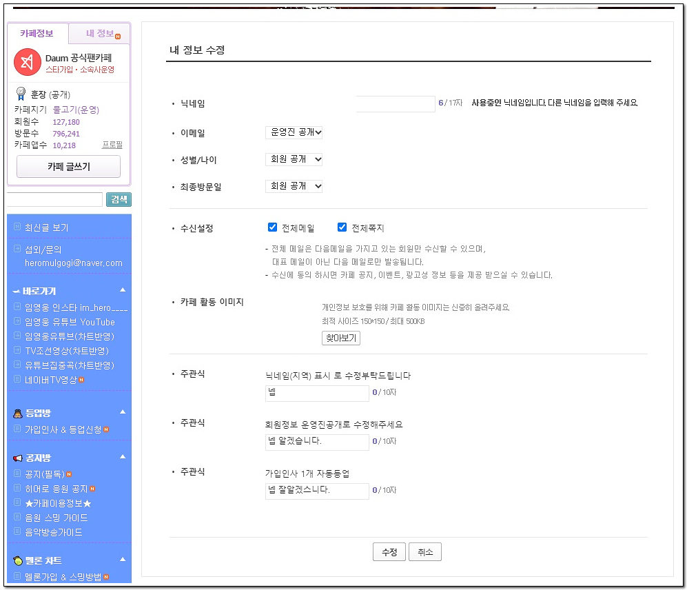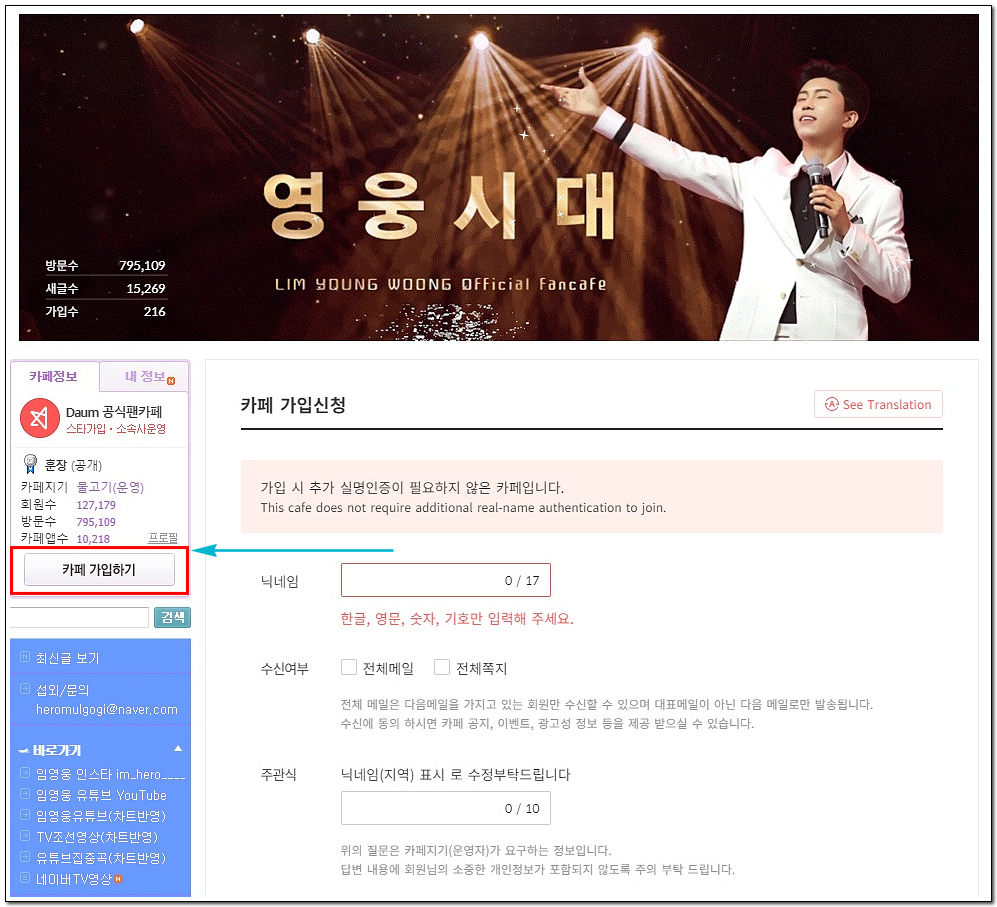 우선 영웅시대 다음 카페로 들어가시면 왼쪽에 카페 가입하기 메뉴 버튼이 있습니다. 그것만 눌러주시면 됩니다. 앗 다음 카페니까 다음에서 로그인은 하셔야 합니다. 그러니까 1번 다음에서 로그인을 하신 다음, 2번 영웅시대 카페로 들어가셔서 왼쪽 메뉴에 보시면 카페 가입하기 메뉴가 있습니다. 그걸 누르시면 위와 같은 화면이 뜹니다. 닉네임 정하시고, 수신여부는 전체메일 전체쪽지 체크하시면 되고요. 닉네임 지역으로 설정하시면 됩니다. 간단하게 작성하신후에 가입하기 누르시면 바로 팬카페에 회원가입이 가능합니다.