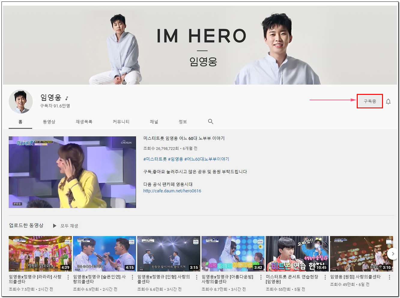 우선 유튜브 회원가입을 하시려면 구글에 회원가입을 하시면 됩니다. 가장 쉽게 구글 회원가입 하는 방법을 올려놓은 포스팅 입니다. 회원가입 포스팅을 한번 보시고 따라해보시면 구글 회원가입을 쉽게 하실수 있습니다. ( 구글 회원가입 포스팅 바로가기 ) 우선 구글에 회원가입을 하셨으면 이제 우리는 IM HERO 임영웅 공식 유튜브로 들어가셔야 합니다. 아래 오른쪽 빨간 구독 버튼 보이시지요. 이 구독 버튼이 회색으로 변해야 합니다. 구독에서 구독중으로 바뀌시면 되는 겁니다. 그러니까 빨간 구독 버튼만 누르시면 됩니다. 그럼 구독에서 구독중으로 바뀌시게 되실 겁니다. 현재 900,000명이 넘었습니다. 구독자수가, 정말이지 대단한 우리의 히어로가 맞습니다. 조만간 백만명 찍을것 같습니다. 우리나라에 백만명 넘는 유튜브 채널 몇개 없습니다. 많은것 같아 보이는데요. 백만명 넘는 유튜브 채널 별로 없습니다. 아무튼 우리의 히어로 멋집니다.