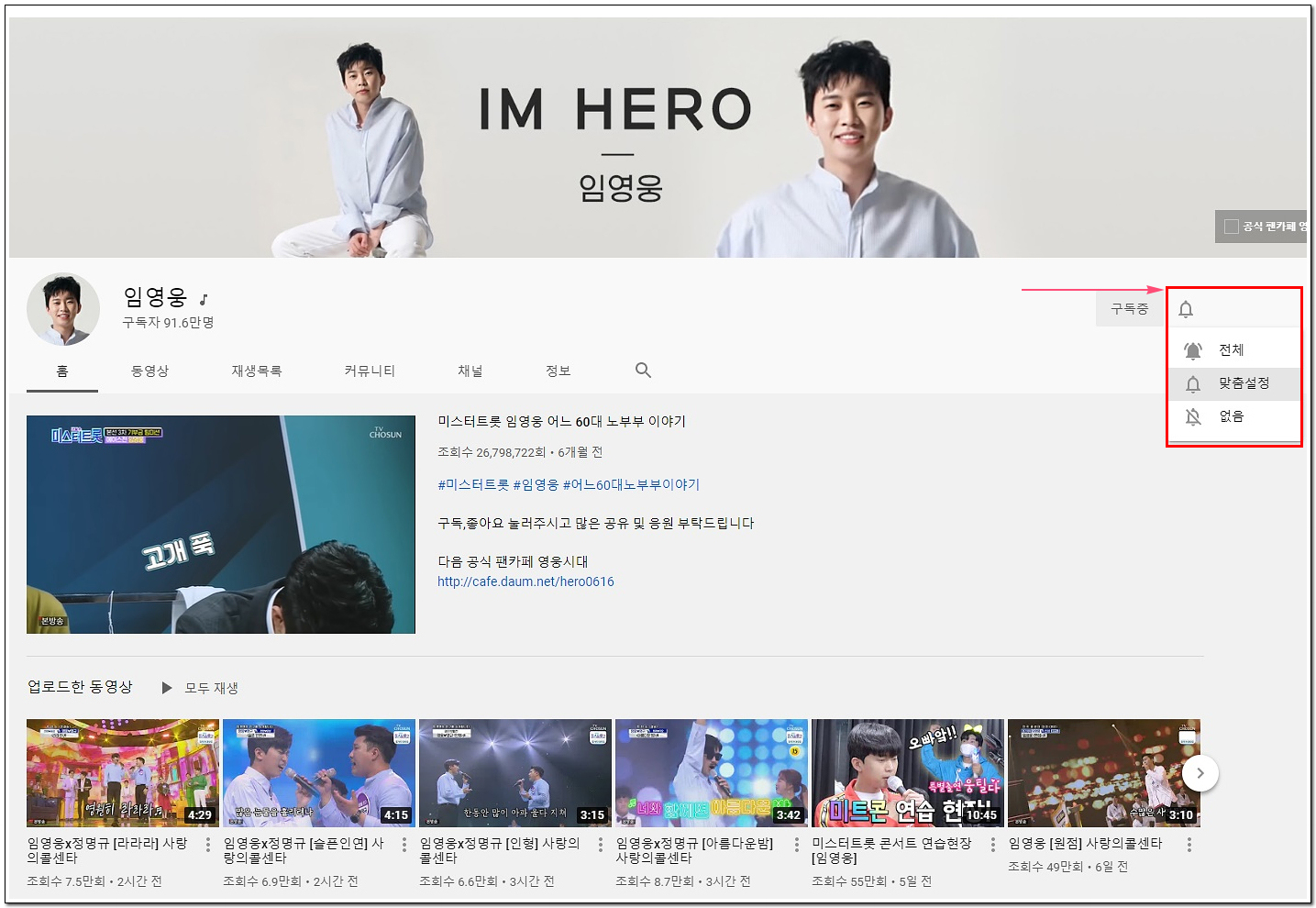 저는 아래에서 보시다시피 IM HERO 임영웅 유튜브 채널의 구독자입니다. 오른쪽 아래 화살표에 보시면 구독중이라고 나오시지요. 저는 구독자 입니다.^^* 그리고 그 바로 옆에 보시면 🔔 종모양의 아이콘이 하나 있습니다. 그걸 누르시면 전체, 맞춤설정, 없음 이라고 나오는데요. 전체를 선택하시면 알람설정이 된겁니다. 그러니까 히어로가 동영상을 업로드 하면 바로 알람이 띵! 하고 울리는 겁니다. 바로 바로 동영상을 시청하실수 있습니다.